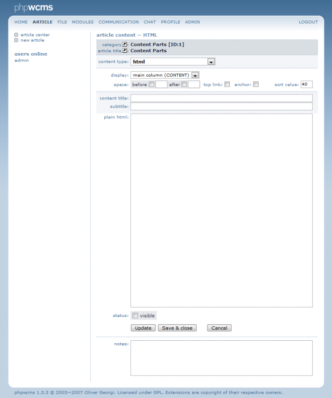 plain html: You can place any HTML code in this field, which will be displayed in the appropriate place in the article. This makes phpwcms very flexible. One can insert a form in an individual article for instance, which passes the form data to an external script. For everyday management, however, this type of content-part is not usually needed. A good introduction to HTML can be found at |