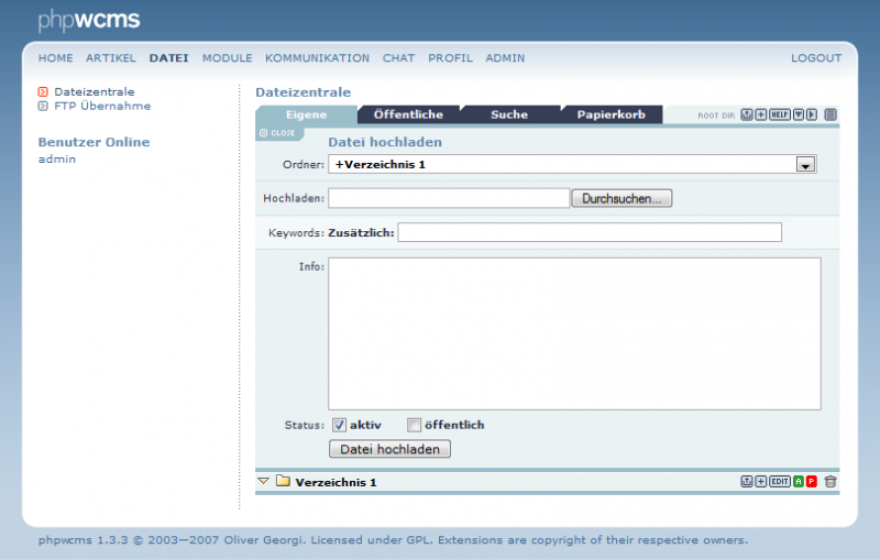 Ausserdem können Sie mit dem Status Aktiv und Öffentlich, genau wie beim erstellen eines Verzeichnisses, bestimmen ob die Datei im Bildbrowser sichtbar ist (aktiv) und ob die Datei auch anderen Redakteueren genutzt werden kann (Öffentlich). Der Haken bei "aktiv" ist vom System herautomatisch gesetzt. Sie können dann noch entscheiden ob die Datei auch noch als "Öffentlich" markiert werden soll.