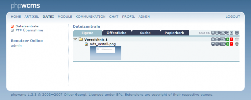 „upload“ oder in das bei der Installation definierte Verzeichnis. - Klicken Sie in phpwcms im Menue unter "Datei" auf „FTP Übernahme“ in der linken Navigation. Sie sehen dann eine Übersicht der hochgeladenen Dateien (Bild 1)